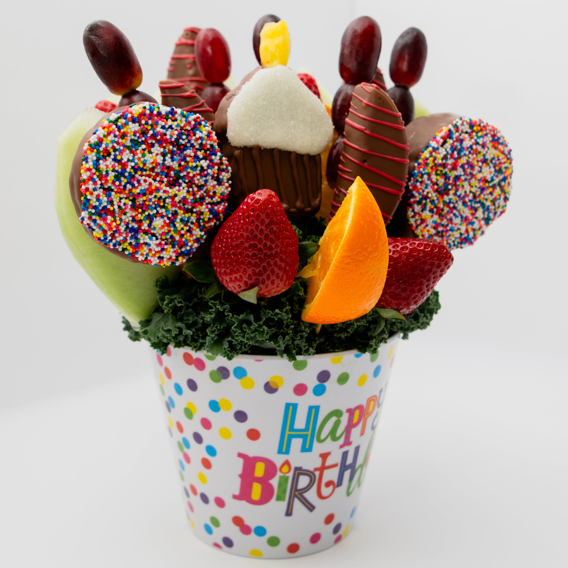 Make their special day unforgettable with our Birthday Bash Celebration Fruit Basket, a joyful explosion of fresh flavors, vibrant colors, and decadent chocolate‑dipped treats. This festive arrangement features juicy strawberries, bright citrus, sweet melon, and plump grapes, all artfully paired with indulgent chocolate‑covered delights sprinkled and drizzled for extra birthday magic. A charming cupcake‑inspired centerpiece adds a playful touch, while the lively birthday container brings instant party energy to any table. Whether you’re gifting, hosting, or surprising someone you love, this fruit basket delivers a perfect blend of freshness, fun, and celebration. A delicious way to say: let the birthday festivities begin.